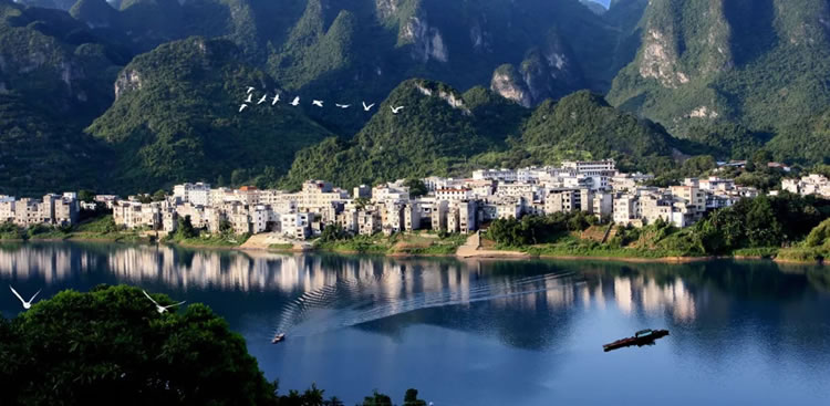 “紅水河第一灣”是國(guó)家AAAA級(jí)景區(qū),位于三石鎮(zhèn)板文村。紅水河在流經(jīng)東蘭縣板文村境內(nèi)拐了一個(gè)大彎,形成一個(gè)“U”字型的大峽谷,山環(huán)水繞,碧如玉環(huán),中間主峰如神龜靜臥,兩岸峰叢對(duì)稱排開(kāi),谷底河灘幾十個(gè)水譚或?qū)ΨQ、或連通,奇妙非常。山間林木翠綠蔥蘢,獼猴跳躍,百鳥(niǎo)爭(zhēng)鳴。在山頂上銅鼓觀景玻璃臺(tái)觀賞第一灣奇景,若在晨起碰到云霧天氣,霞光普照,霧繞神灣,幻若仙境。有詩(shī)描述:“一灣驚天下,回首造高峽,千山還壯美,奔流再出發(fā)!”該景區(qū)是紅水河的精華河段,是攝影、探險(xiǎn)、休閑度假的好地方。