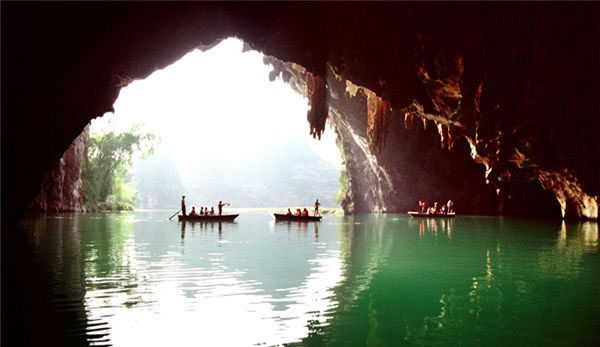 百鳥巖位于甲篆鄉(xiāng)烈屯西北面的漠齋山下,別名龍虎洞。因洞內(nèi)燕子棲集,蝙蝠掠飛,又名百鳥洞。盤陽河自吉屯白熊洞潛入山下,形成1000多米的伏流暗河后,在此洞流出。洞口寬50米,一石壁把洞口分成兩個略呈三角形的左右洞口。左側(cè)洞口寬40米,高15米,兩洞口內(nèi)側(cè)相通。洞深500米,蜿蜒曲折,直通與白熊洞一山之隔的拉類坳下的一個側(cè)洞口。洞中水平如鏡,深不可測,寬處約40米,窄處10米,從洞口行舟至300米轉(zhuǎn)折處,距水面30米處有一圓形天窗,山坳之光照到水面,猶如舞臺上的光束,色彩紛呈,近右側(cè)洞口處有沙灘,可?恐鄞。沙灘右側(cè)是一塊30多平方米的石臺,臺面深溝淺窩,坑坑坎坎,石臺一側(cè),洞壁雪白,可攀援其中。有石鷹、石柱、石幔、石觀音菩薩等,百態(tài)千姿,令人目不暇接。石臺的周圍有仙女梳妝、海螺石,石螺對面有石桌、石缸和石松果等。側(cè)面洞口外香椿林下野花艷目植被繁衍,把洞口點綴得幽靜雅致。洞中歧洞叉水道不可勝數(shù),密如蜂房,不知所向,整個洞仿佛一座裝飾華麗、景幻莫測的水下龍宮。其奇特的景象似桂林蘆笛巖,又因非乘舟不能游覽,游人贈予“水上蘆笛巖”的美譽。