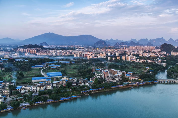 地形地貌 富川瑤族自治縣位于桂東北山區(qū),四面環(huán)山,中間低落,略呈橢圓形盆地,地勢北高南低。西部及東南部分布著橫亙連綿的山脈,谷深坡陡,地勢高峻;東部為石灰?guī)r溶蝕而成的巖溶峰林地貌,群峰拔挺;東北面為丘陵地貌,頂圓坡緩,波狀起伏;中部為寬坦的溶蝕平原地區(qū),地勢低陲,孤峰獨山拔地而起。