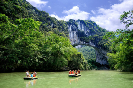 布柳河仙人橋景區(qū),地處樂業(yè)縣新化鎮(zhèn)磨里村布柳河大峽谷,距縣城51公里,該峽谷全長16.9公里。沿河兩岸綠樹成蔭,古樹繁多,野猴成群,鳥語鳴啼,有“植物的王國,鳥類的天堂”之美稱,河里魚兒穿梭,既可漂流,又可觀光旅游,被專家稱為“桂西第一漂”。尤為奇特的是,布柳河上還有一座由三座大山塌陷形成的天然石拱橋,坐落于漂流河段下游。石橋天成,鬼斧神工,橋拱對稱,拱底平滑,當?shù)厝朔Q為“仙人橋”。仙人橋拱孔跨度177.14米,橋寬19.3米,橋身長280米,橋身厚78米,總橋高165米,拱高87米,像一條巨龍橫跨在河的兩岸,絕景天成,氣勢雄偉,是罕見的天然石拱橋。被專家稱為世界上最大、最美的水上天生橋,具有極高的觀賞價值。