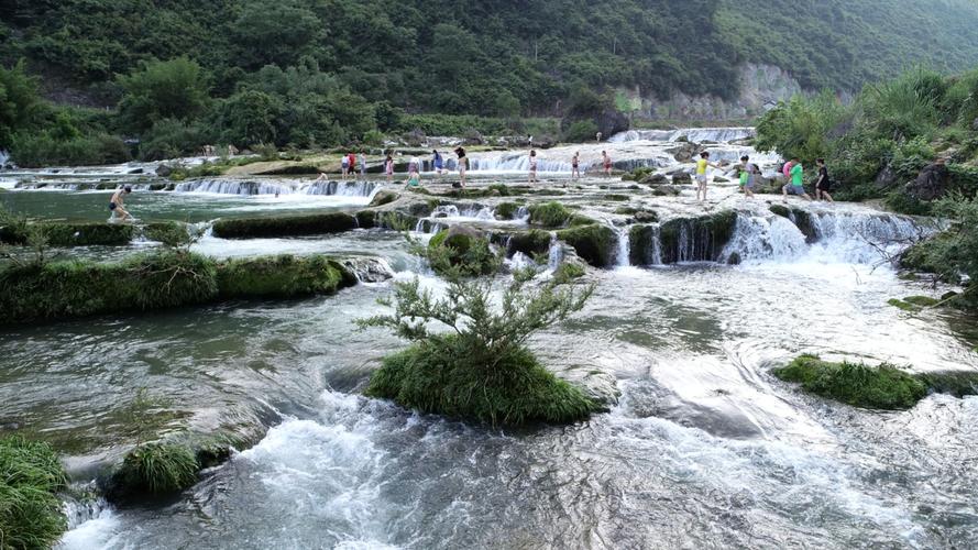 響水瀑布洛江灘頭,河水奔流而下,其聲隆隆,遠(yuǎn)聞若雷,近聞似鼓,四季如此,故此得名“響水”。此響水灘為典型的喀斯特地貌,水流呈階梯狀分布,在地質(zhì)學(xué)上稱為邊石壩,所含成份多為鈣化石?膳c九寨溝五彩池比美。