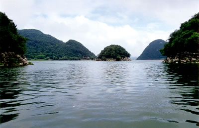 南湖的面積最大,景點(diǎn)也最多,南湖以洞多洞奇揚(yáng)名。首先映入眼簾的,是一組奇目的山巖壁石,這是小巧瓏?yán)识痔烊恍纬傻摹芭杈吧健薄_@里的石頭色彩特別豐富,青灰和棕黃的頁巖直插入碧水之中。大湖面逐漸狹窄,這兩邊的巖岸,如同斧劈劍削,有些游人把它呼為“小三峽”;這一片景觀石峰林立,如同到插的刀劍,給秀美的湖水增添幾許陽剛之氣,人們把它稱為“小石林”;這里的巖石,別有風(fēng)姿,它橫看不成嶺,側(cè)看不成峰,一片又一片向上堆積,有如卷幟浩繁的典籍,人們把它稱為“峭壁天書”。