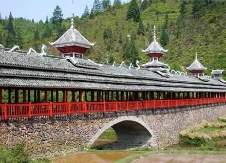 在侗鄉(xiāng)能和鼓樓媲美的,是侗寨的風(fēng)雨撟,俗稱花撟。凡侗族人聚居地區(qū),有河必有撟,撟梁全都建筑在村前寨后的交通要道上。大部分為木撟,還有石拱撟石板撟竹筏撟等,寬四五米。青石作墩,杉木鋪撟面,上面是瓦頂長廊。長廊兩旁設(shè)欄桿長凳,形如游廊,可供行人躲避風(fēng)雨,觀賞休憩。