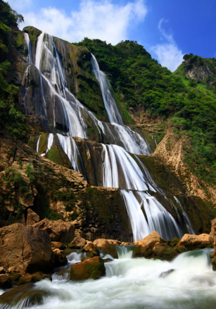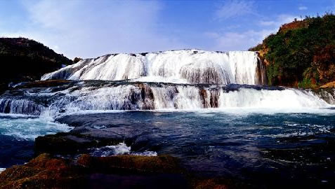 “遙聞水聲轟轟,從隴隙北望,忽有水自東北山腋瀉崖而下,搗入重淵,但見(jiàn)其上橫白闊數(shù)丈,翻空涌雪,而不見(jiàn)其下截,蓋為對(duì)崖所隔也。”這是徐霞客在《徐霞客游記》中對(duì)陡坡塘瀑布的描述。陡坡塘瀑布因1985年曾在該瀑布拍攝電視連續(xù)劇《西游記》序曲《敢問(wèn)路在何方》中,唐僧師徒四人牽馬過(guò)河的場(chǎng)景而聲名遠(yuǎn)播。