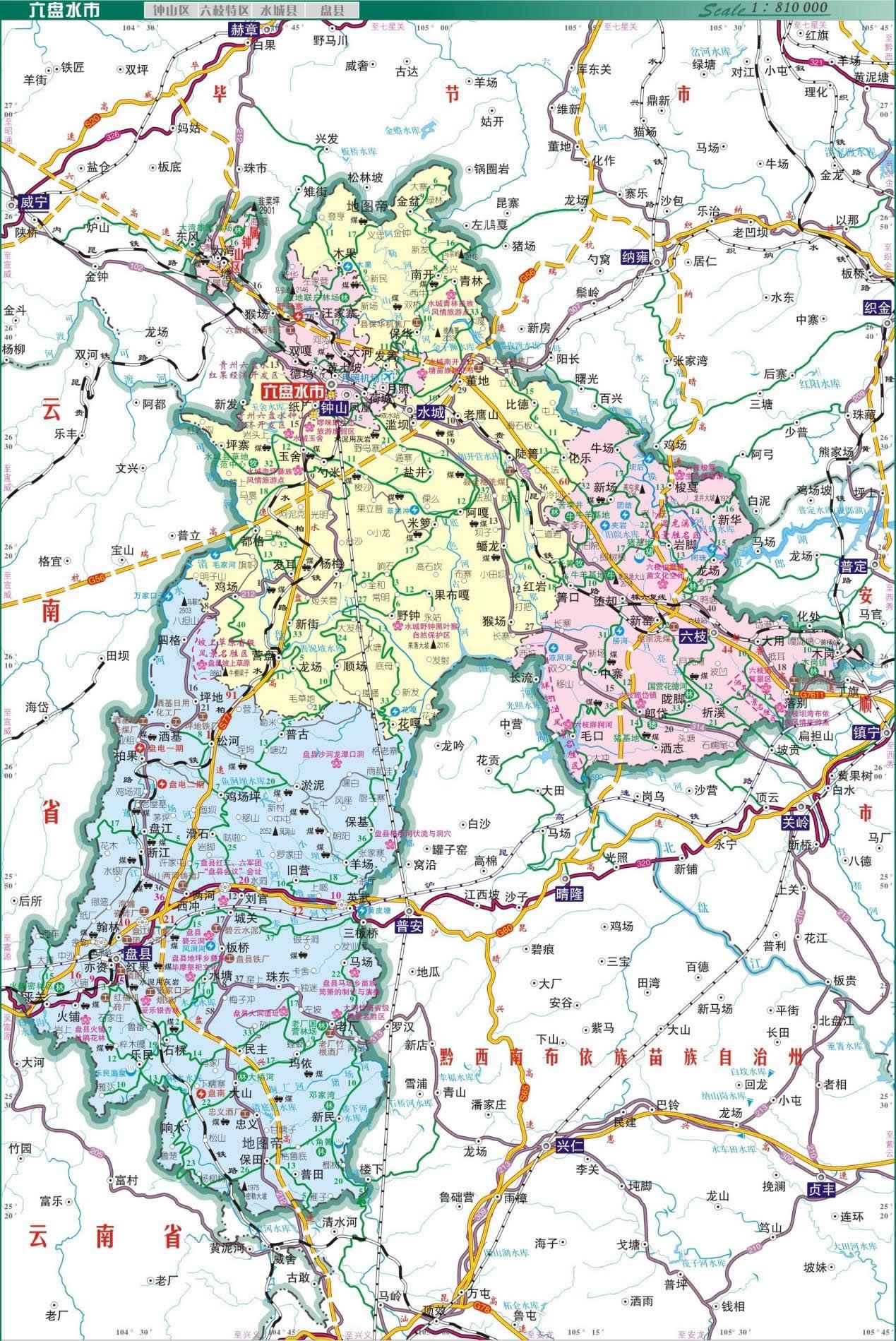 盤州市 面積4056平方千米,人口106.93萬(wàn),政府駐亦資街道鳳鳴北路1號(hào),下轄6個(gè)街道、14個(gè)鎮(zhèn)、7個(gè)鄉(xiāng)