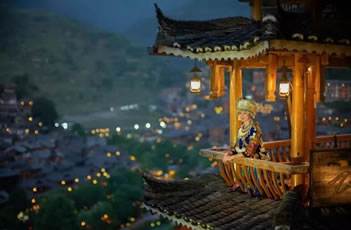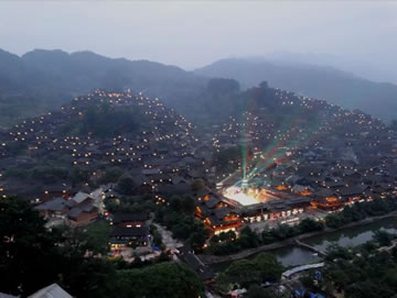 黃昏時分,西江千戶苗寨千家萬戶就亮起了燈。隨著天色越來越暗,西江千戶苗寨變成燈的海洋,西江千戶苗寨呈現(xiàn)牛頭的形狀。西江千戶苗寨景區(qū)在山坡高處的路邊修建了觀景臺,開通觀光車。