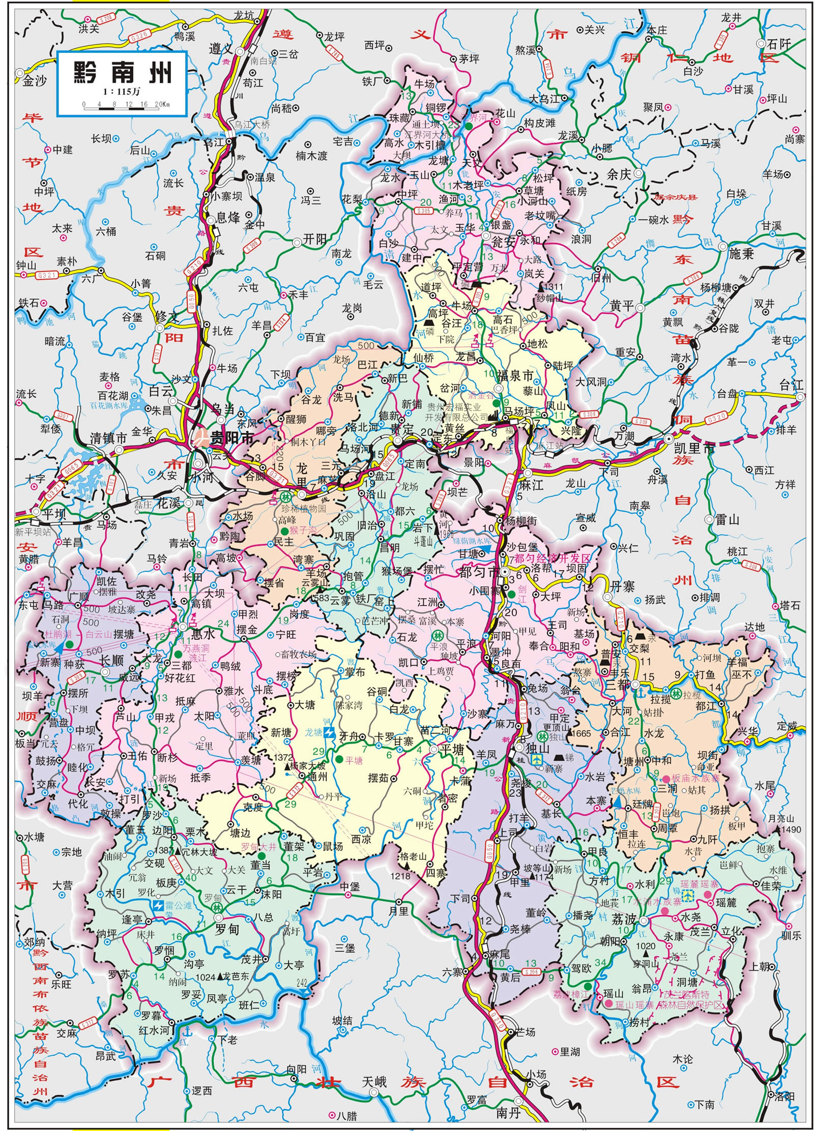黔南布依族苗族自治州轄2個縣級市、9個縣、1個自治縣: