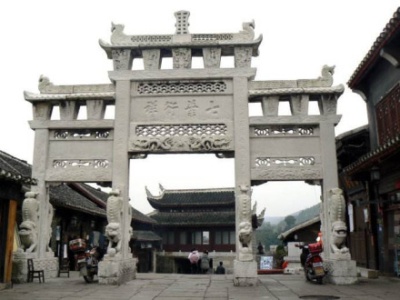 青巖古鎮(zhèn)城中原有八座牌坊橫跨在石板鋪筑的大街上,如今尚存兩座百歲坊和一座貞節(jié)牌坊。定廣門內(nèi)的趙理倫百歲坊,是清道光二十三年(1843年)奉旨建造的。它是一座四柱三間、三樓四阿頂?shù)氖品唬?.5米,寬約9米。精心雕琢的石牌坊,在藍(lán)天白云之中,顯得空靈。正中的橫額上,鐫刻著道光皇帝的題額,正面是“七葉衍祥”,背面是“升平人瑞”,上端有“欽賜”二字。抱柱的四對(duì)石獅子非同尋常,不是站獅,也不是臥獅或蹲獅。八頭獅子仿佛是從高山上俯沖下來(lái),富有靈性。