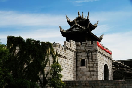 北城門又稱玄武門,為重檐歇山式頂木結(jié)構(gòu)建筑,屋頂為青灰色瓦面,泥塑脊飾,是古代欽差下達(dá)皇帝圣旨的場(chǎng)所,初建于明朝天啟年(1621—1624年),清順治十七年(1600年)班麟貴之子應(yīng)壽子承父職(土司)將土城墻改建為石城墻,清嘉慶三年(1789年),武舉人袁大鵬重修擴(kuò)建,是青巖古鎮(zhèn)的象征之一。