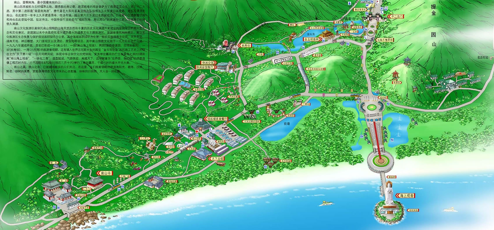 三亞南山風景區(qū)是國家旅游局確定的“中國旅游業(yè)發(fā)展優(yōu)先項目”。它位于中國唯一的熱帶濱海城市三亞市的西部,是全國罕見的超大型文化和生態(tài)旅游園區(qū)。園區(qū)規(guī)劃面積五十平方公里,其中海域面積十多平方公里,由美國紐約國際城市設計公司統(tǒng)籌規(guī)劃,美國經(jīng)濟咨詢聯(lián)合公司提供可行性報告。項目內(nèi)容策劃分別由中國佛教文化研究所、中國民俗學會、中國歷史博物館、中央民族大學、中國環(huán)境科學院、中國科學院生態(tài)中心完成。該項目是海南省的重點建設項目,同時被三亞南山風景區(qū)是國家旅游局確定的“中國旅游業(yè)發(fā)展優(yōu)先項目”。它位于中國唯一的熱帶濱海城市三亞市的西部,是全國罕見的超大型文化和生態(tài)旅游園區(qū)。園區(qū)規(guī)劃面積五十平方公里,其中海域面積十多平方公里,由美國紐約國際城市設計公司統(tǒng)籌規(guī)劃,美國經(jīng)濟咨詢聯(lián)合公司提供可行性報告。項目內(nèi)容策劃分別由中國佛教文化研究所、中國民俗學會、中國歷史博物館、中央民族大學、中國環(huán)境科學院、中國科學院生態(tài)中心完成。該項目是海南省的重點建設項目,同時被海南省授予“海南省生態(tài)建設示范工程”、“海南省生態(tài)旅游示范景區(qū)”,并得到了中央有關部門、佛教界、文化界的高度重視。它的建成填補了海南歷史文化旅游的空白,進一步突出海南大生態(tài)旅游優(yōu)勢,為中國旅游添光增彩。