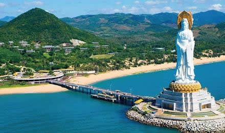 三亞南山海上觀音圣像敬造工程因其規(guī)模宏偉、意義殊勝、佛理底蘊豐富,被譽為“世界級、世紀級”的佛事工程。像體為正觀音的一體化三尊造型,寶相莊嚴,腳踏一百零八瓣蓮花寶座,蓮花座下為金剛臺,金剛臺內(nèi)是面積達15000平方米的圓通寶殿。金剛洲由長280米的普濟橋與陸岸相連,并與面積達60000平方米的觀音廣場及廣場兩側主題公園,共同組成占地面積近30萬平方米的“觀音凈苑”景區(qū)。
