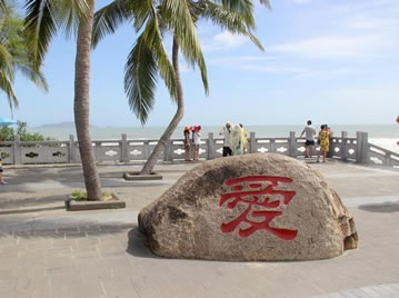 景點(diǎn)位于廣場的左右側(cè),在此矗立著兩塊石刻,左側(cè)的“愛”字,右側(cè)是“情定天涯海角,相愛白頭到老”。這愛情石刻圍繞著廣場中央的天涯海角星,與海面上的心形 “愛情石”遙相呼應(yīng)。