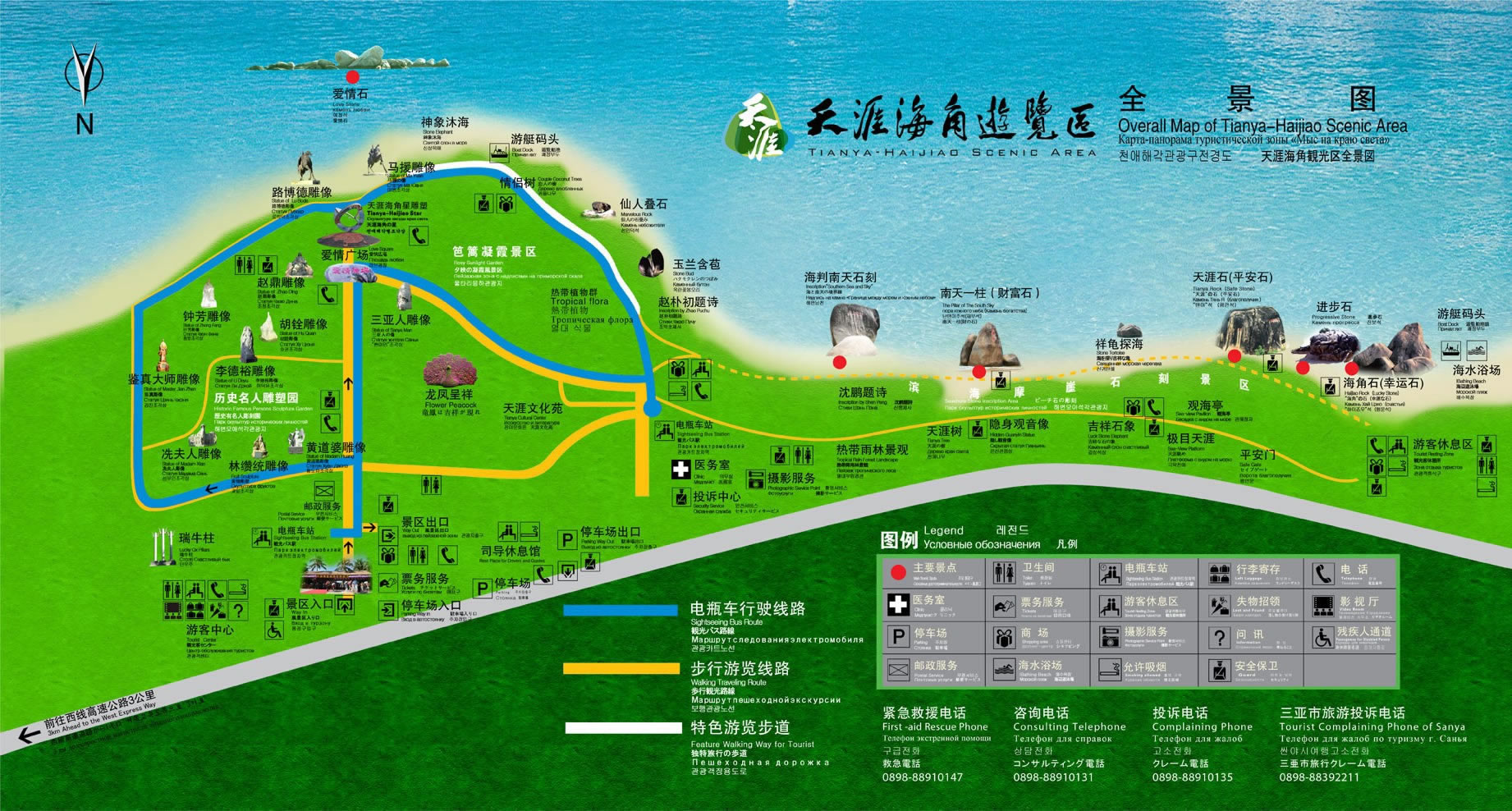 2、步行游覽線路:從大門口環(huán)繞歷史名人雕塑園游覽一圈,然后沿著海濱特色游覽步道行走,游覽笆籬凝霞景區(qū),欣賞熱帶植物群,繼續(xù)沿著步道走,游覽熱帶雨林景觀、天涯樹、隱身觀音像,到海邊觀看摩崖石刻群,然后原路返回,在電瓶車重點(diǎn)站處走天涯路步道,參觀天涯文化苑,然后經(jīng)三亞人雕像到愛情廣場,沿主干道到景區(qū)出口。 |