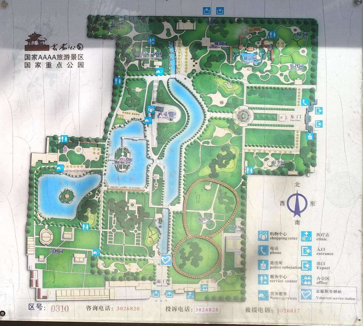 在雪松外是花圃地,主路北邊自東向西依次分布著牡丹園、梅園、盆景園、槐萌園、七賢祠、邯鄲碑林、玉蘭園。主路南邊是自東向西分布著月季園、山幽苑,山幽苑往南以前是游樂場和小吃城,后改為武靈廣場和敬候廣場、花園廣場,亭臺樓閣遍布其中。