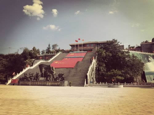 位于陳列館臺階正下方,占地1萬平方米?勾笤诖宿k學(xué)期間為學(xué)員操場和訓(xùn)練場,1941年5月,在這里隆重舉行了抗大五周年校慶活動。廣場與陳列館之間由30米寬的臺階相連接。