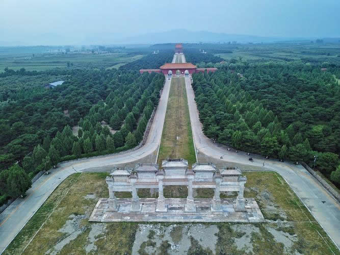 入關(guān)第一帝世祖順治皇帝的孝陵位于南起金星山,北達(dá)昌瑞山主峰的中軸線上,其余皇帝陵寢則以孝陵為中軸線按照“居中為尊”、“長幼有序”、“尊卑有別”的傳統(tǒng)觀念依山勢在孝陵的兩側(cè)呈扇形東西排列開來。各陵按規(guī)制營建了一系列建筑,總體布局為"前朝后寢"!鞍俪邽樾,千尺為勢”的審美思想貫穿于每一座陵寢建筑中。