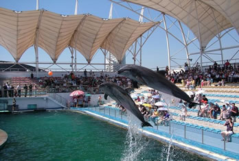 海豚表演館于2000年5月1日正式營(yíng)業(yè),投資近6000萬(wàn)元人民幣,占地面積約3000平方米。三面環(huán)座的看臺(tái)可同時(shí)容納2000名游客,站在看臺(tái)極目遠(yuǎn)眺,表演池和大海仿佛融為一體。在優(yōu)美音樂(lè)的伴隨下,不僅可以欣賞到海豚的水中華爾茲、空中頂球、跳圈、跨桿、環(huán)場(chǎng)鞠躬跳等高難度的精彩表演;還可以領(lǐng)略海獅投籃、水中霹靂舞、中國(guó)功夫等出色的演技;同時(shí)您還有機(jī)會(huì)親身觸摸海豚,與它握手交流,共同感受人與自然默契相通的美好境界。