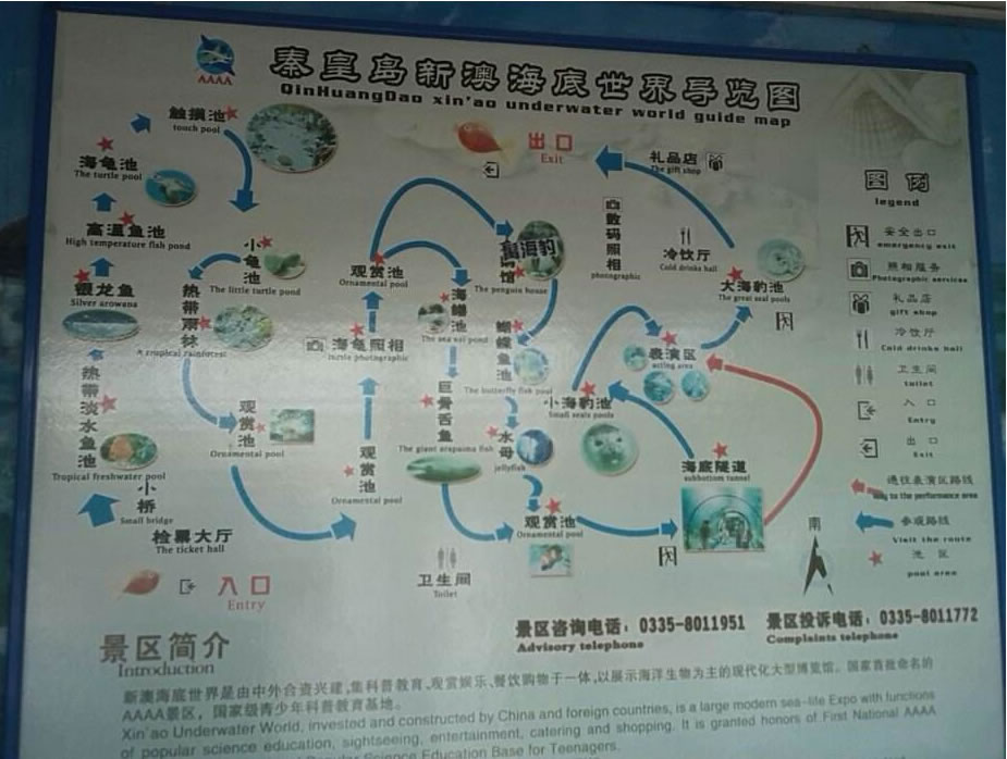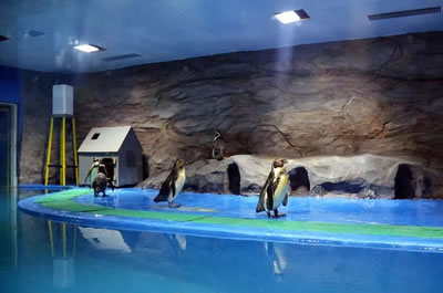 秦皇島新澳海底世界總建筑面積約2萬(wàn)平方米,總儲(chǔ)水量約650萬(wàn)千克。景區(qū)主要由水族館和海豚表演館兩部分組成,其中,水族館主要包括小池區(qū)、企鵝館、海豹館、觸摸池、海底隧道、表演區(qū)、科普展廳、科普教室以及海洋精品店等部分組成。