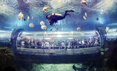 海底世界水族館飼養(yǎng)著來(lái)自世界各地的海洋動(dòng)物200多種,共10,000多艉(頭),其中有大量國(guó)家一級(jí)、二級(jí)珍稀保護(hù)動(dòng)物,檸檬鯊、豹紋鯊、護(hù)士鯊、海豚、江豚、綠海龜、海獅、海豹、蝠鲼、海狗供游人觀賞。270度環(huán)形的亞克力玻璃圍成的海底隧道全長(zhǎng)100米左右,五光十色的珊瑚環(huán)繞在您的周?chē),迷人的海底?dòng)植物盡收眼底。透過(guò)窗口還可以看到一個(gè)古羅馬被海水淹沒(méi)城市的石像造景。海豚表演館占地面積1萬(wàn)平方米,建筑面積3,000平方米,總貯水量200萬(wàn)千克,能同時(shí)容納2000多人同時(shí)觀看表演,以展示生活在海洋中哺乳動(dòng)物的海獸表演為主,是一座具有國(guó)際標(biāo)準(zhǔn)的海洋動(dòng)物表演劇場(chǎng)。游客在此可以看到聰明可愛(ài)的海豚和滑稽可笑的海獅聯(lián)袂上演精彩紛呈的各項(xiàng)表演:海獅獻(xiàn)上迪斯科、倒立平衡、一獅兩球、套彩圈、單手倒立、頂球過(guò)障礙、親吻、水中交誼舞等一系列惟妙惟肖的表演;海豚上演的水中芭蕾舞、踢足球、環(huán)場(chǎng)鞠躬跳躍、伴著樂(lè)曲引吭高歌以及充分展示海豚智力的各種表演活動(dòng)。