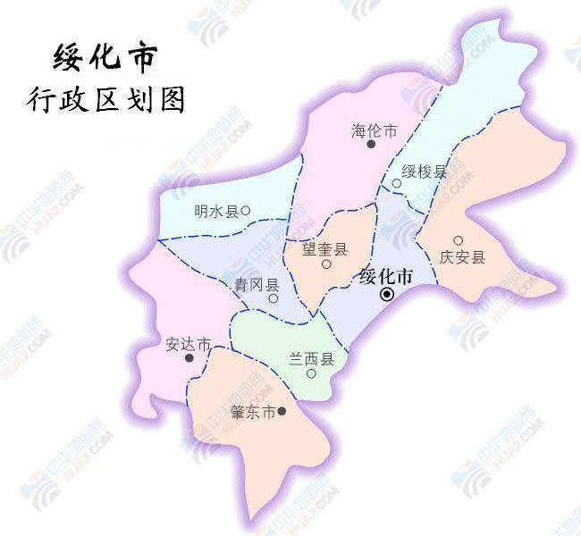 綏化市轄1個(gè)市轄區(qū)、6個(gè)縣、代管3個(gè)縣級(jí)市:
