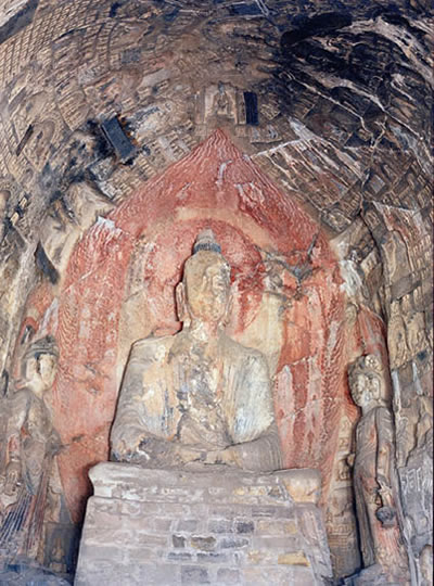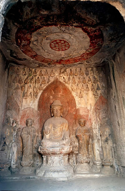 賓陽中洞是北魏時期(公元386~512年)的代表性作品。這個洞窟前后用了24年才建成,是開鑿時間最長的一個洞窟。洞內(nèi)有11尊大佛像。主像釋迦牟尼像,面部清秀,神情自然,堪稱北魏中期石雕藝術(shù)的杰作。主像座前刻有兩只姿態(tài)雄健的石獅。左右侍立二弟子,二菩薩,菩薩像含笑凝眸,溫柔敦厚。洞中還雕刻著眾菩薩,弟子聽法的浮雕像,栩栩如生?唔旓w天仙子的刻畫也十分傳神。