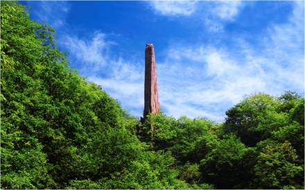 天碑高達50余米,是一個巨型崩塌巖塊。由于崩塌時的位移,原來近水平產(chǎn)出的巖層此時呈直立狀,巍然聳峙在峽谷一側(cè),高大雄偉、氣勢恢弘,一景多變,步移景換,從不同角度仰望,或蒼鷹、或飛鳥、或飛魚、或刀背、或天碑,大自然賦予其無限美感。傳說,這本是二郎神斬殺小白龍的大刀,圣母媧皇在安置了小白龍神位之后,又把二郎神丟下的大刀豎立起來,刀背對著無頭冤神洞,于是二郎神斬殺小白龍的大刀,成了紀念小白龍的無字碑,人們稱其為“擎天刀碑石”。