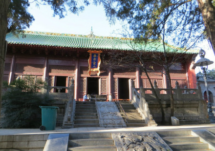大雄寶殿位于天王殿后。大雄寶殿是寺院佛事活動(dòng)的中心場(chǎng)所,與天王殿、藏經(jīng)閣并稱為三大佛殿。原建筑毀于民國十七年(1928年),1986年重建。殿內(nèi)供釋迦牟尼、藥師佛、阿彌陀佛的神像,殿堂正中懸掛康熙皇帝御筆親書的“寶樹芳蓮”四個(gè)大字,屏墻后壁有觀音塑像,兩側(cè)塑有十八羅漢像。殿內(nèi)供奉著釋迦牟尼、阿彌陀佛、藥師佛的神像,屏墻后面懸塑觀音像,兩側(cè)有十八羅漢侍立。大雄寶殿東側(cè)的殿宇是緊那羅殿,重建于1982年。