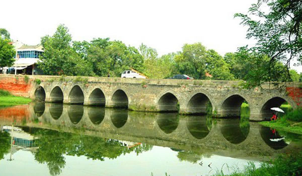 老城九孔橋:自明弘治十年(公元1497年)到建國后的1950年10月老城鎮(zhèn)一直是沈丘縣治所所在地,城南緊靠東西流向的泉河,當時河寬水深,各種貨物可上通漯河,下達臨泉、潁州(現(xiàn)阜陽市),經(jīng)潁上至正陽入淮河,當時是一條繁盛的“黃金水道”。但城南無橋,南北兩岸大量人員來往,貨物運送,全靠船渡,因水大、人多、貨物超載或遇急風惡浪,每年都有事故發(fā)生。1973年、1981年沈丘縣人民政府兩次撥款4.1萬元,維修九孔橋。因九孔橋是周口至臨泉的主要交通干道,經(jīng)常有幾十噸的大貨車在橋上行駛,常年承受著交通重載,所以到1998年南橋頭西側(cè)倒塌了十幾米,致使車輛無法行走。1999年,沈丘縣人大代表、老城東升布鞋廠廠長郭傳興個人出資5萬元,南關(guān)行政村支部書記張連營負責施工補修,把橋加長4米,全橋長達99米,19天后竣工,F(xiàn)橋體基本完好,車輛行人稱便。