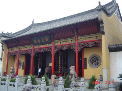 中院的主體建筑是大雄寶殿。該殿初建于清順治十八年(1661年),后經(jīng)多次維修,F(xiàn)大雄寶殿是清光緒三十四年(1908年)重修,經(jīng)過近年來的維修,氣勢宏偉。大殿正中供奉著釋迦牟尼坐像,兩側(cè)為其弟子阿難和迦葉,均為托沙雕塑。釋迦“偏袒右肩,結(jié)跏趺坐”,十分莊嚴靜穆,威儀儼然。佛像后的背光是用樟木雕刻而成的“五龍捧圣”的圖案。佛像前還有韋馱、彌勒、地藏像,佛像后是一組海島觀音像,只見海島觀音赤足站在鰲頭上,左右侍立著龍女和童子,背后是一面高達八尺的泥塑懸崖峭壁,足下碧波萬頃,怒濤洶涌。整個塑像向前傾覆。人們仰視上去,只見觀音衣袖似在飄動,正在洶涌的波濤上迎面向你浮來,增加了宗教藝術的感染力。