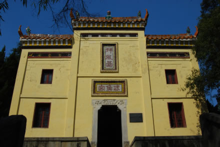 又名武侯宮,坐赤壁山東南處的南屏山頂,是為了紀念在三國演義描述的赤壁之戰(zhàn)中,諸葛武侯在此“設壇臺、借東風、相助周郎”而建造的。整個建筑面積有310平方米,分前后兩殿廟堂,內(nèi)殿供有劉備、關(guān)羽、張飛、諸葛亮的全身塑像,袍帶飄逸,栩栩如生。左側(cè)有文物陳列館,建于1979年,館內(nèi)陳列赤壁出土文物1000余件,有刀、槍、劍、戟、鏃、戈、帶鉤及東吳銅幣(“大錢當千”、“大泉五百”、“大泉當百”),并有東漢銅鏡和“剪輪五銖”錢及大量東漢、三國時的陶器等。右側(cè)“東風閣”于1975年建造,供游人歇憩。今拜風臺系1935年重建,1948年維修。