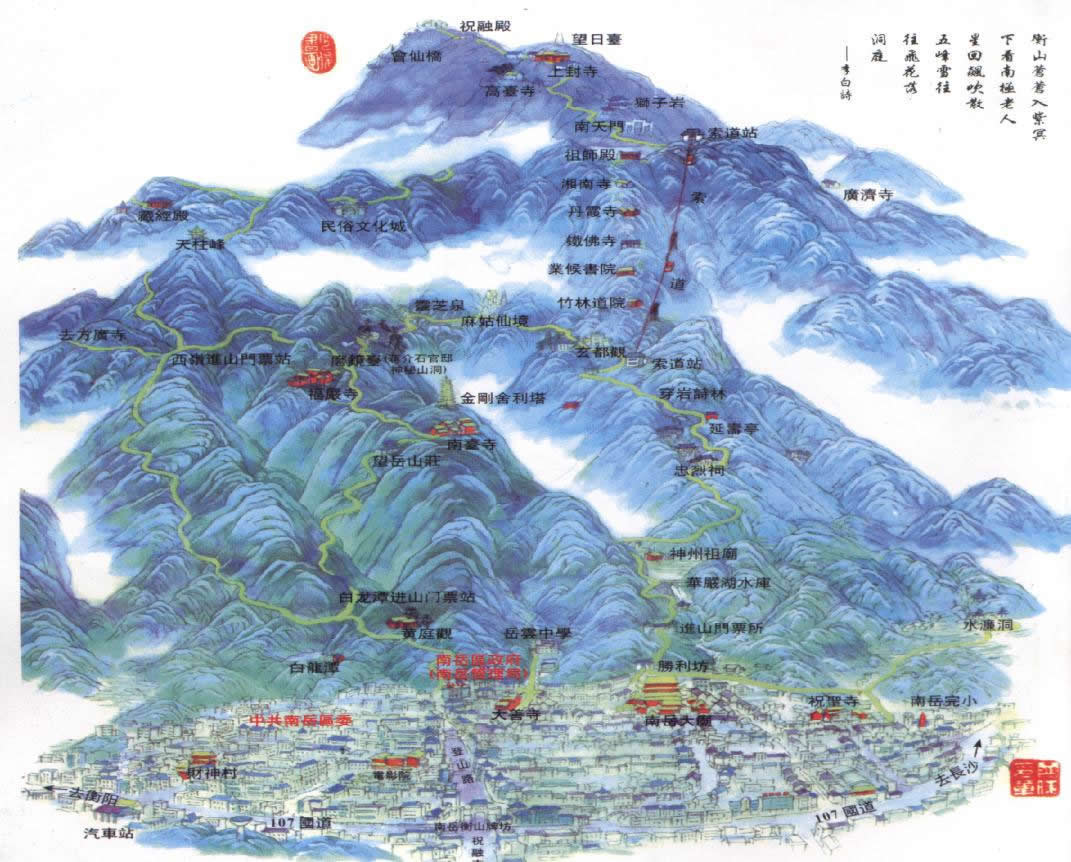 衡陽市南岳衡山旅游區(qū)南距衡陽市中心35千米,屬南岳區(qū)管轄,總面積184平方千米,為國務(wù)院1982年第一批公布的國家重點(diǎn)風(fēng)景名勝區(qū)。有9溪、10橋、24泉、15洞、9池、9潭、38巖等!白H诜逯,藏經(jīng)殿之秀,方廣寺之深,水簾洞之奇”,古稱南岳“四絕”,“麻姑仙境之幽,穿巖詩林之趣,龍鳳飛瀑之雄,禹王古城之古”,是南岳“新四景”。南岳旅游風(fēng)景名勝區(qū)居湘中偏東地區(qū),以主峰祝融為中心,總面積184平方千米。大致分南岳古鎮(zhèn)、水簾洞、忠烈祠、磨鏡臺(tái)、祝融峰、藏經(jīng)殿、方廣寺、龍鳳潭8個(gè)游覽區(qū)和西嶺1處避暑區(qū)。