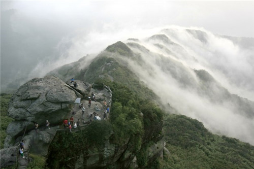 祝融峰是衡山的最高峰,是中國紀(jì)念人文祖先祝融氏的山峰!白H诜逯摺睘槟显里L(fēng)光“四絕”之首。由于常年煙云的烘托和群峰的疊襯,加之它矗立于地勢相對(duì)低洼的湘南盆地之中,更顯得它峻極天穹。在古語中“!笔浅志糜肋h(yuǎn)之意,“融”是光明之意,“祝融”是永遠(yuǎn)光明。唐代大文豪韓愈在《游祝融峰》詩中贊嘆道“萬丈祝融拔地起,欲見不見輕煙里”。北宋黃庭堅(jiān)寫道:“萬丈祝融插紫霄,路當(dāng)窮處架仙橋。上觀碧落星辰近,下視紅塵世界遙!贝颂帪閿埲悍澹慈粘,觀云海,賞雪景的最佳去處。