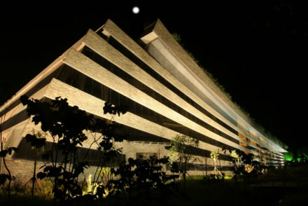 黃龍音樂廳位于生態(tài)廣場(chǎng)入口處,由黃龍洞投資股份有限公司按國(guó)際標(biāo)準(zhǔn)建設(shè),建筑面積為4970平方米,總投資1.6億元,座位818個(gè)。該音樂廳背靠植被茂盛的黃龍洞山體,面朝浩瀚的稻田,南鄰潺潺東流的索溪水。整個(gè)建筑為框剪式結(jié)構(gòu),3250平方米斜坡面屋頂全部為綠茵花草屋蓋,是全球最大的綠化屋頂;其外墻由當(dāng)?shù)厍嗍?yè)巖構(gòu)建成的音符弦線幕墻與自然融合一體,形如一本即將展開等待世人閱讀的張家界文化寶典,又如鑲嵌在張家界的一塊翡翠,被譽(yù)為“世界環(huán)境最美音樂廳”。