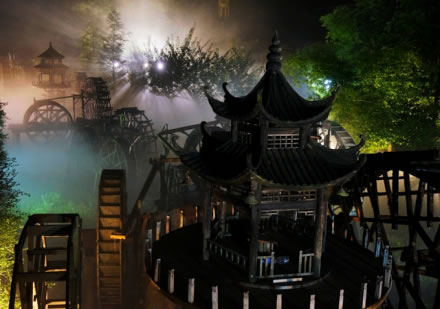 風(fēng)雨長(zhǎng)廊位于田園牧歌景觀區(qū)東頭,取臥龍之形,伸展于山谷之中,從田野一直延伸到黃龍洞進(jìn)口。風(fēng)雨長(zhǎng)廊為木質(zhì)吊腳樓穿斗結(jié)構(gòu),做工十分精細(xì),榫卯巧妙連接,雖然不用一顆鐵釘?shù)珔s非常穩(wěn)定、堅(jiān)固。置身長(zhǎng)廊,不僅可以防止日曬雨淋,還可以品讀富有地域特色的湘西建筑文化。