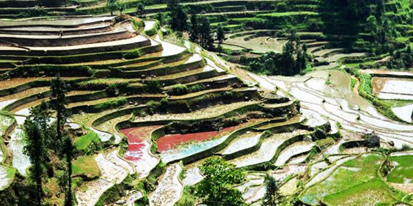 紫鵲界梯田位于新化縣西部山區(qū)水車鎮(zhèn)境內(nèi),她周邊的梯田達(dá)8萬(wàn)余畝以上,其地勢(shì)之高,規(guī)模之大,形態(tài)之美,堪稱世界之最。紫鵲界生態(tài)環(huán)境優(yōu)美,梯田密集,形態(tài)原始,阡陌縱橫,線條流暢,山高水長(zhǎng),板屋交錯(cuò),充分展示出梯田的自然美、古樸美、形體美、文化美。尤其是隨著四季氣候的變化,使紫鵲界梯田更加婀娜多姿,如臨人間仙境。水奉公路盤旋于這些梯田之間達(dá)十余公里,梯田遍布于海拔500米至1000余米的十幾個(gè)山頭上,最大的不過1畝,最小的只能插幾十蔸禾,連綿起伏,輾轉(zhuǎn)盤旋,可謂是儀態(tài)萬(wàn)方,令人贊嘆不已。據(jù)調(diào)查,紫鵲界梯田成型已有2000余年歷史,是苗、瑤、侗、漢等多民族