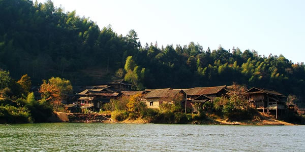 苗族寨落大多依山傍水,或在山?jīng)_,或在溪畔。村前寨后,喜植楓、椿、樟、梧,雜以棕櫚崐修竹。住宅大多為木結(jié)構(gòu)建筑。其中雙層重檐木質(zhì)卯榫結(jié)構(gòu)的吊腳樓最有特色。吊腳樓下空間為牲畜圈、灰屋和廁所,一樓為住所,二樓為放置糧食等物的倉(cāng)庫,一般四排三間,一正一橫;也有的六排五間,一正兩橫。一樓面前有較寬的走廊,連接中堂與橫屋。走廊靠檐邊裝有帶靠背的長(zhǎng)條板凳。