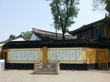 藏經(jīng)樓系原來(lái)收藏陳放經(jīng)書處,面闊3間,寬9.8米;進(jìn)深9.2米。藏經(jīng)樓樓屋頂有《西游記》中孫悟空、唐僧、豬八戒、沙悟凈的雕塑像。一樓內(nèi)墻壁上嵌有《金剛般若波羅蜜經(jīng)》的經(jīng)文(系禪宗)。還嵌有董其昌(1555一1636年,上海松江人,明代杰出的書畫家)等人的書法碑刻。鐘樓為二層,八角。樓下石碑為重修寒山寺時(shí)所立,正面碑文為程德全所撰,碑的背面刻有重修寒山寺時(shí)募捐者的名字和金錢額。傳說(shuō)張繼詩(shī)中的鐘就是懸于原來(lái)這里的鐘樓樓上。鐘樓建筑和這里的鐘都不是唐代的了,這口鐘是清代光緒三十二年(1906年)重鑄的,距今有100多年的歷史。月落烏啼霜滿天,江楓漁火對(duì)愁眠。姑蘇城外寒山寺,夜半鐘聲到客船!边@是唐代詩(shī)人張繼寫的。傳說(shuō)詩(shī)人張繼去唐時(shí)首都長(zhǎng)安(今西安)赴考后,落第返回時(shí),途經(jīng)寒山寺,夜泊于楓橋附近的客船中,夜里難以成眠,聽(tīng)到寒山寺傳來(lái)的鐘聲,有感而作!稐鳂蛞共础吩(shī)在日本幾乎家喻戶曉。日本的小學(xué)生把這首詩(shī)作為課文來(lái)講授和背誦。