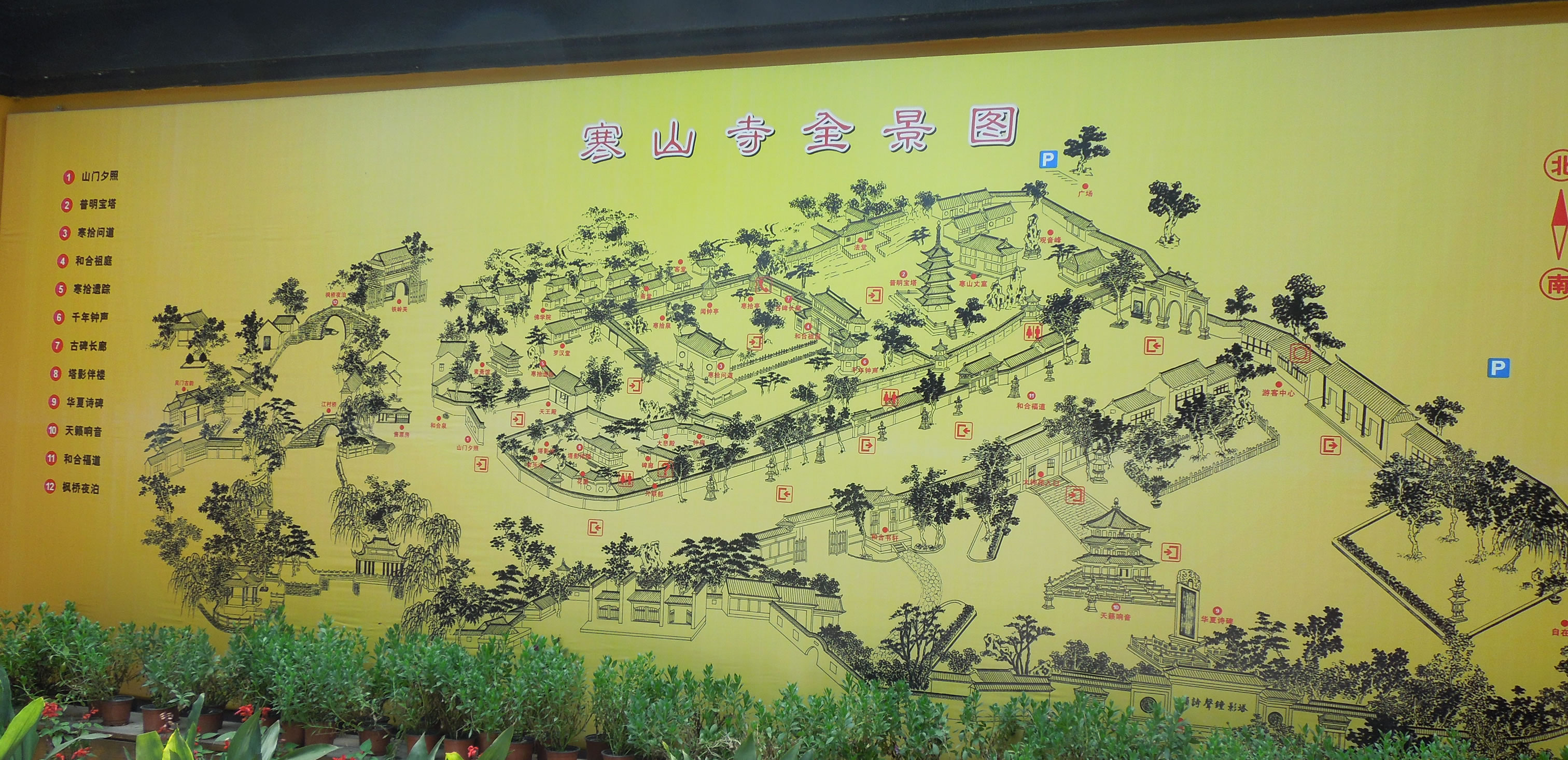 寒山寺的主庭園左側(cè)的花壇兩面嵌長(zhǎng)條石刻兩塊,一為明代崇幀年間刻的"寒拾遺蹤";另一刻清末江蘇巡撫程德全寫的"妙利宗風(fēng)"。出大雄寶殿,左通普明寶塔和方丈室,右達(dá)名聞遐邇的聽(tīng)"夜半鐘聲"的鐘樓,正前方的兩層屋宇是藏經(jīng)樓。遠(yuǎn)望屋頂,可見(jiàn)唐僧、孫悟空等西天取經(jīng)塑像群。藏經(jīng)樓樓上秘藏珍貴佛經(jīng),樓下叫"寒拾殿",寒拾殿后墻的背面立一巨碑,刻著千手千眼觀音、韋馱和關(guān)公等人物。鐘樓就在寒拾殿旁。