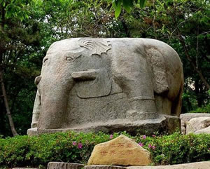 從龍洞西行,在林木掩映的山坡上.屹立著一座碩大的漢代圓雕石象。石象依一塊花崗巖巨石的自然形狀雕刻而成雕刻而成,象身高2.6米,長(zhǎng)4.8米,背寬3.5米,石像耳闊體肥,四肢健壯,長(zhǎng)鼻巨牙、卷尾粗足,形態(tài)雄奇,豐滿肥碩。象身西側(cè)有一高0.88米,寬0.49米,深0.2厘米的陰鑿凹面,系未見刻銘的題榜,象身東側(cè)以陰線刻一高1.13米,寬0.62米的方框,內(nèi)刻隸書“象石”字樣,在刻銘與象前腿之間,還鑿刻了一個(gè)頭梳“丁”字形發(fā)髻,手持勾鞭,腳帶鐐銬高0.92米的馴象奴。象的四足均踏著蓮花,體現(xiàn)了佛教中六牙白象王在水中步步蓮花的故事傳說(shuō)。它是孔望山漢代佛教造像有機(jī)整體中不可分割的一部分。此石系目前我國(guó)發(fā)現(xiàn)的東漢時(shí)期最大的圓雕石刻,石象南側(cè)約一百五十米處,還有與此同時(shí)期的石雕鎮(zhèn)海蛙,此蛙為當(dāng)時(shí)鎮(zhèn)海之物。體長(zhǎng)240厘米,寬220厘米,通高110厘米,石蛙頭部略損,前兩肢半殘,眼睛陰刻,背上遍刻陰線鱗紋。這兩座石雕,別特是石象,氣勢(shì)雄偉,造型精美。均為我國(guó)珍貴的石刻藝術(shù)珍品。