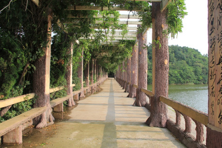 紫藤文化長(zhǎng)廊位于三仙湖東北岸,建于2007年10月。長(zhǎng)133米,寬3.8米,高4米,長(zhǎng)廊中有76根柱子,柱子上有從古至今的76位名人題寫的詩詞。紫藤文化長(zhǎng)廊6個(gè)大字,由原中央電視臺(tái)副總編輯、中央電視臺(tái)書畫院院長(zhǎng)趙立凡寫。