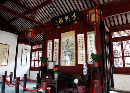 主建筑仿明代結(jié)構(gòu),俗稱“紗帽廳”。因梁頭棹木像明代官帽的帽翅,故名。該庭院高大寬敞,肅穆莊重。五架梁兩側(cè)中心刻有“八駿圖”,梁兩端刻有“鳳穿牡丹”。梁底則刻有“稱心如意”、“必定高中”等圖案!凹喢背帷保戳侯^棹木)上刻有《三國演義》中的“古城會(huì)、三英戰(zhàn)呂布”等八幅戲文透雕,形象逼真,呼之欲出。這組透雕被《中國戲曲志·蘇州分卷》收錄。