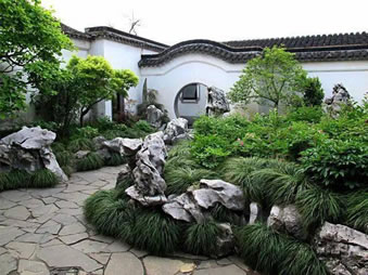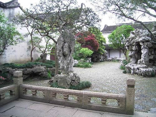 網(wǎng)師園分三部分,境界各異。東部為住宅,中部為主園。網(wǎng)師園按石質(zhì)分區(qū)使用,主園池區(qū)用黃石,其他庭用湖石,不相混雜。突出以水為中心,環(huán)池亭閣也山水錯落映襯。西部為內(nèi)園(風(fēng)園),占地約1畝。北側(cè)小軒三間,名“殿春簃”。軒北略置湖石,配以梅、竹、芭蕉成竹石小景。軒西側(cè)套室原為著名畫家張大千及其兄弟張善孖的畫室“大風(fēng)堂”庭院假山,采用周邊假山布局,東墻峰洞假山圍成弧形花臺,松楓參差。南面曲折蜿蜒的花臺,穿插峰石,借白粉墻的襯托而富情趣,與“殿春簃”互成對景;ㄅ_西南為天然泉水“涵碧泉”。北半亭“冷泉亭”因“涵碧泉”而得名。亭中置巨大的靈壁石。