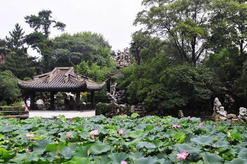 春秋閣東南下,有面闊五間、平挑入水、半架河上、前設(shè)半亭的水榭。延伸處有貼水平臺,三面圍以欄桿,中開方洞,露出水面一方,名“問魚淵”。時見小魚悠游,伸手可掬。水榭中間,由費新我書“層波疊影”額。水榭連廊,穿過春秋閣直通數(shù)魚檻,其中一段架于水面,故名“水旱廊”。數(shù)魚檻緊倚千步長廊,面闊七間,臨水而筑,池對面建有半亭,是從西水仙廟遷來。密密斗拱托撐飛檐之頂,古色古香。穿亭向前,有延伸入池的半島,上建六角攢尖的“綠漪亭”。 假山群在蠡園入口和“層波疊影”之間。一大片湖石堆疊而成的奇峰,嶙峋多姿,氣勢不凡。一條石徑,盤旋曲折,忽高忽低,忽寬忽狹,忽明忽暗。置身其間,聞聲不見人,可望不可即,如入迷宮。假山都以“云”字為題,有“云窩、云腳、穿云、朵云、