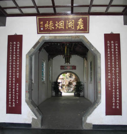迎面八角形門洞上方,為“蠡湖煙綠”匾,由原江蘇省政協(xié)主席孫領(lǐng)先生手書。兩側(cè)為128字的“門”字長聯(lián),無垢撰句,陸修伯書。聯(lián)云:一湖春風秋月,多少事,專諸膾魚,范蠡著書,千載艷說西施,又道張渤開犢,朱衣復(fù)虞俊忠魂,遺王問草堂,高子水居,蓼莪辟青祁苑囿,卜筑歷時七旬,蔚然今朝規(guī)模;