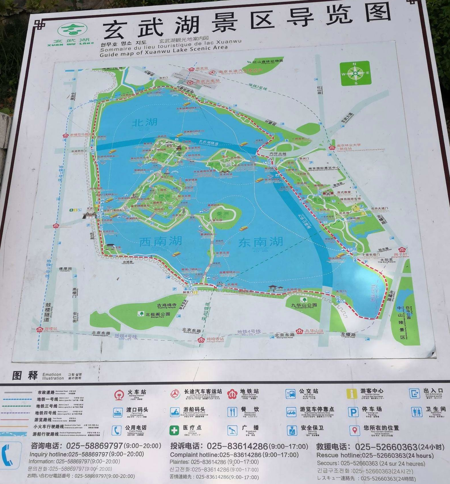 玄武湖環(huán)湖路全長9.8公里,總面積56萬平方米,周圍分部著眾多的南京著名景點,環(huán)湖路西南半邊為南京明城墻圍繞,城墻外便是繁華的都市,靜與鬧僅一墻之隔。北岸自西向東依次為神策門公園、南京火車站,東岸自北向南依次為南京國際展覽中心、情侶園、白馬公園,南岸自東向西依次為太平門、九華山公園、古閱武臺、南京武廟、雞鳴寺、解放門、臺城,西岸自南向北依次為玄圃、玄武門、杉林氧吧、萬三花園,其中西岸和南岸均有南京明城墻為依。