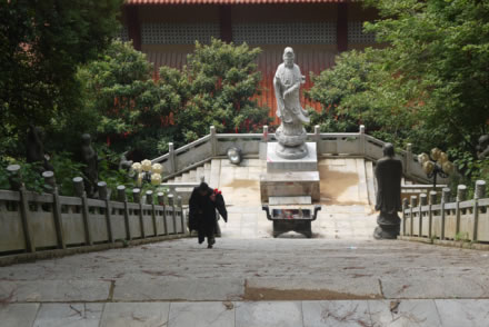 天寧古寺有過極盛的年華,隨著滄桑的變遷,屢經(jīng)摧殘,古寺蕩然無存。至1985年9月僅存一座高不到 二米、面積不足18平方米,風(fēng)雨飄搖的觀音間,神龕上只有一張圖像供游客參拜,當(dāng)年61歲的萬仁英同志,誠虔地來此剃發(fā)為尼,授法號(hào)叫釋順因,并將她多年的積蓄六千元贊助寺內(nèi)作經(jīng)費(fèi)。在古寺住持垂范下,用了七年時(shí)間,建成了一座氣派軒昂,規(guī)模宏偉的綜合性寺廟。建筑面積達(dá)五千平方米,屹立在灣里區(qū)南端,接待八方香客和游人。