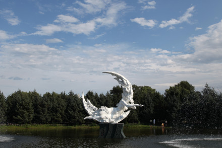 女神廣場是景區(qū)大型活動的主要舉辦地,凈月女神雕塑佇立在噴泉廣場的中心。凈月女神是凈月潭標志性迎賓景觀,由國內(nèi)首屈一指的雕塑大師葉毓山先生精雕細琢創(chuàng)作而出,于2012年8月7日正式落成。凈月女神高8.2米,月亮直徑6米,底座高2.28米。整體看上去,如女神側(cè)臥在弦月之上,左手托腮凝思,右手探向遠方,秀發(fā)隨風舞動,雙目微合,女神與弦月有機融合為一體,弦月表面的粗糙和女神本身的光潔細膩形成鮮明的對比,在動靜結(jié)合中展現(xiàn)了高超的藝術(shù)表現(xiàn)力。凈月女神體現(xiàn)了美麗,圣潔,向上,大愛的生命主題。