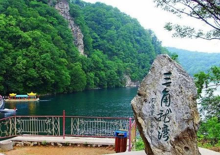 三角龍灣又名黑龍?zhí)叮瑐髡f有一條三只角的黑龍距此修煉,經(jīng)常行云布雨,除惡降魔,普濟四方百姓,后來黑龍飛往長白山天池,龍去留淵,留有一灣圣水。位于輝南城朝陽鎮(zhèn)東南45公里處的高山密林之中。系古代火山噴發(fā)口積水而成,因水面呈三角形,加之湖南側矗立著30米高的三角石,故名“三角龍灣”。是進入長白山的門戶之一。這里自古以來風光秀美,景色迷人。我國著名第二大火山群—龍崗火山群就分布在這里。