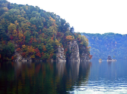 映霞壁是碼頭邊的陡峭石壁,高90余米,面向正東,每天朝陽初升的時候,萬丈霞光與水氣發(fā)生了光學折射,遠遠望過來,佛光普照,宛如迷離仙境一般。