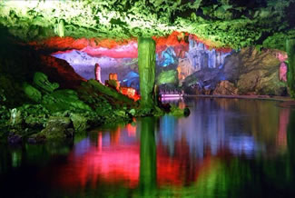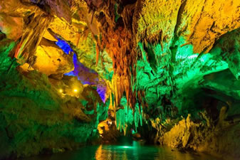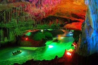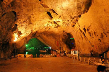 通往水洞的碼頭,千余平方米的水面,宛如一幽靜別致的“港灣”,燈光所及,水中游船、洞中石景倒映其中,使人如入仙境。從護(hù)岸石階拾級(jí)而下,通過長(zhǎng)廊從碼頭上船,即可暢游水洞。水洞全長(zhǎng)5800米,現(xiàn)已開發(fā)2800米,面積3.6萬平方米,空間40余萬立方米,最開闊處高38米,寬70米。